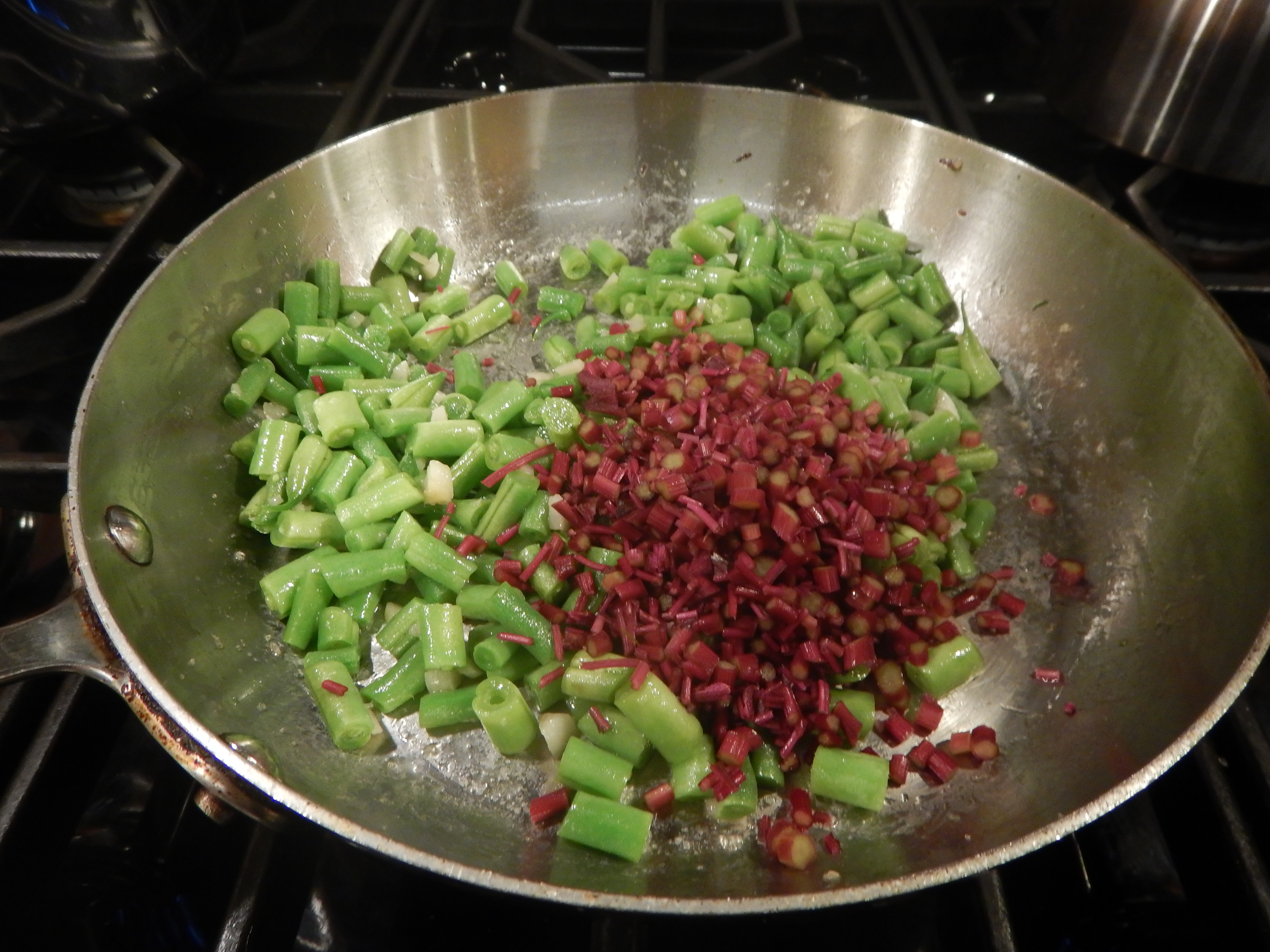 3. While the quinoa is cooking, prepare the green beans and amaranth. Remove the stem end from the green beans and cut into ½-inch pieces. Separate the stems and leaves of amaranth. Roughly chop the amaranth leaves into bite-sized pieces. Set aside. Cut the lower 1 inch of stem off and discard it. Finely chop the remaining stem.